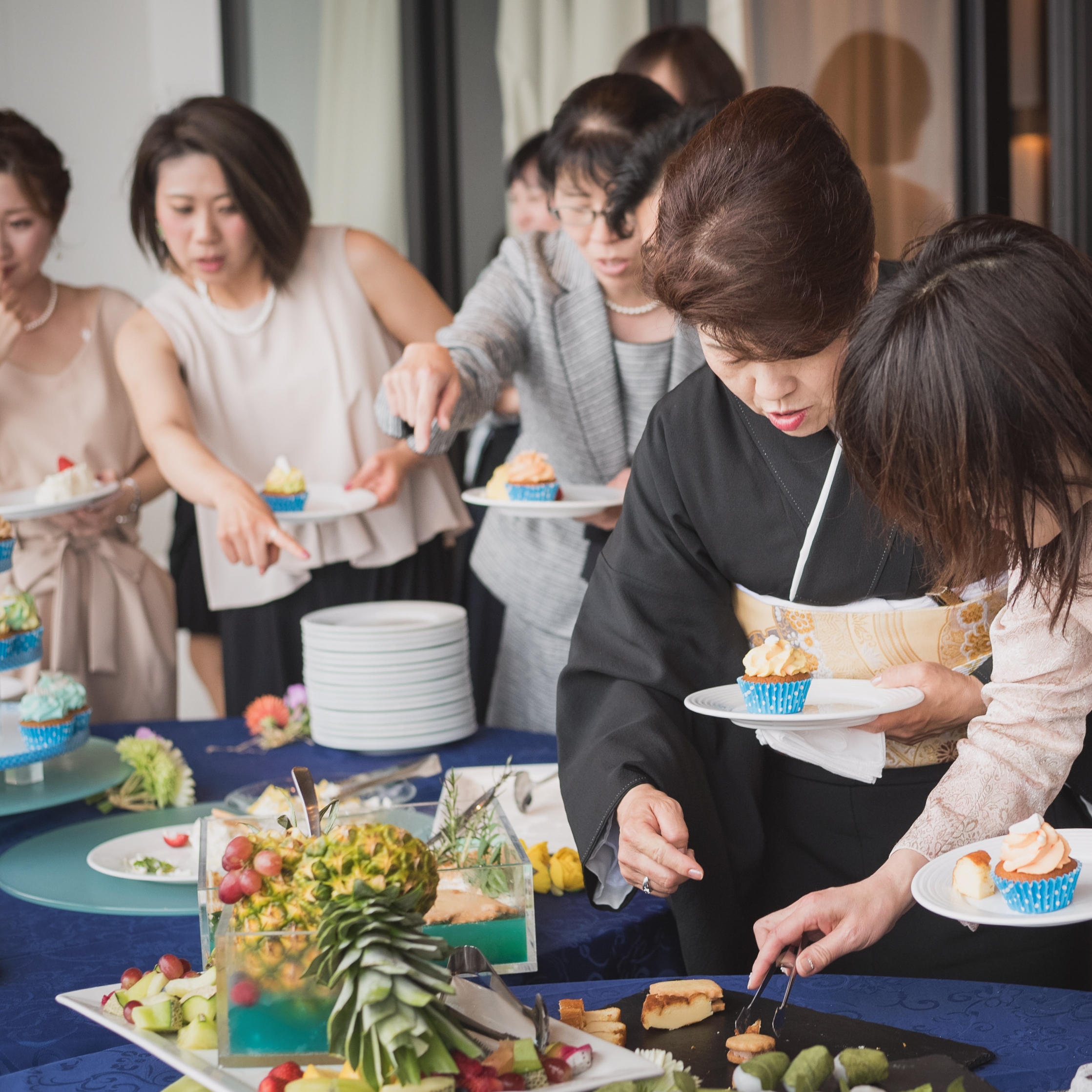 シェフと1から打ち合わせできるお料理はゲストからも大好評でした。スイーツブッフェは洋菓子だけでなくフルーツや和菓子も含めラインナップか豊富で女性ゲストだけでなく男性ゲストも楽しめていました。