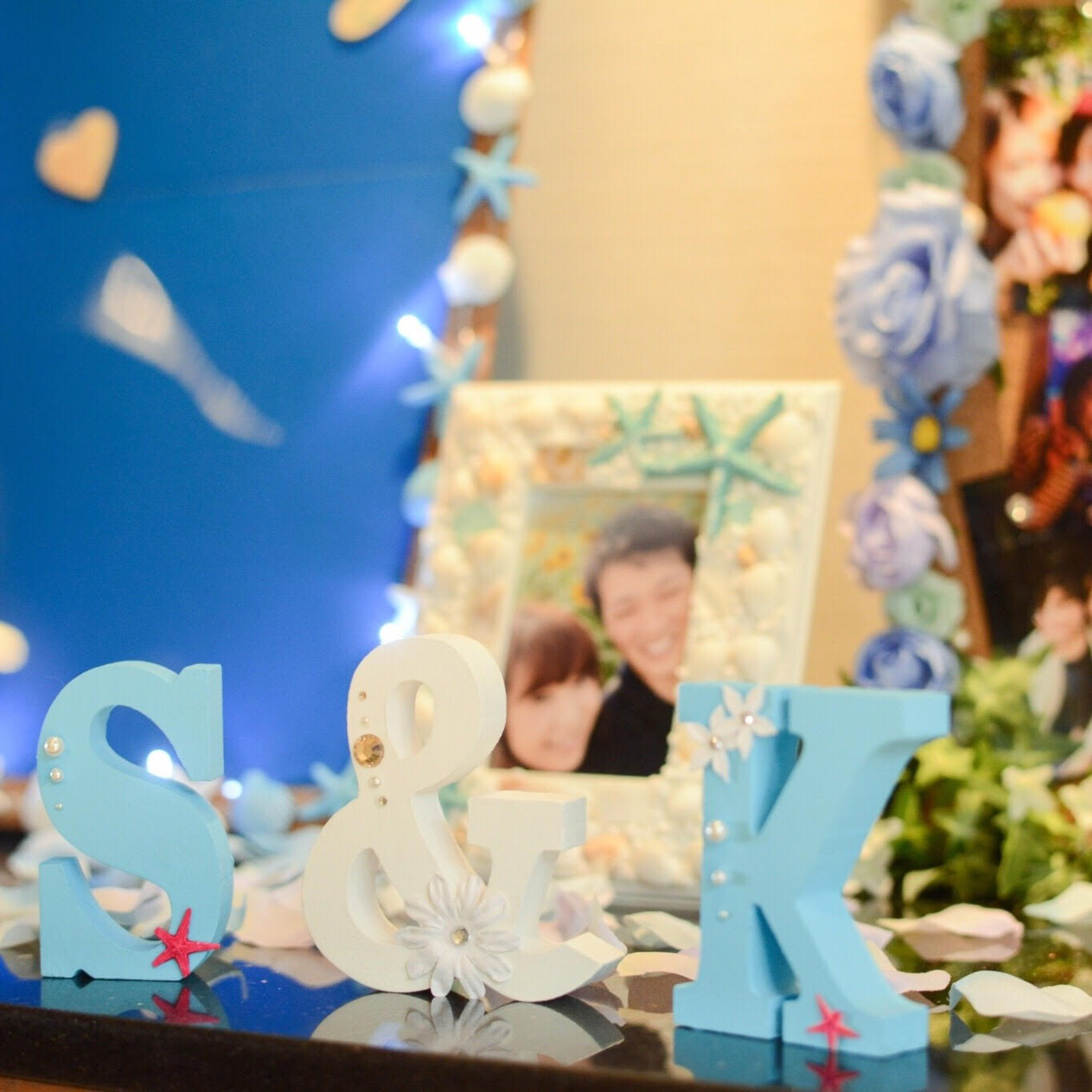 貝殻も受付にガーランドで飾ったり、ゲストテーブルに少し散りばめたりして