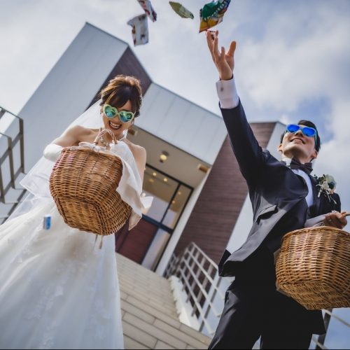 ①アフターセレモニーは定番のブーケトスではなく、ゲスト全員が参加できるお菓子まきに