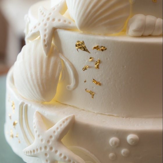 「貝殻と金箔をのせたウェディングケーキ」や