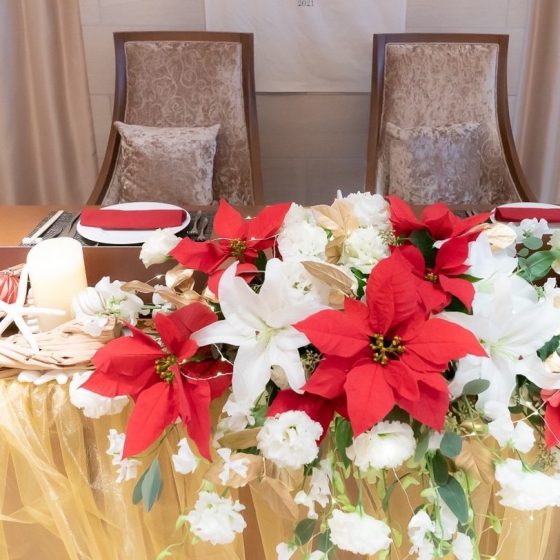 「ポインセチアと貝殻を組みあわせたデザインの高砂」などで