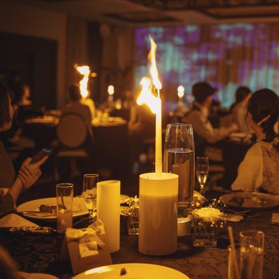 そのために、プロジェクションマッピングの演出の最中にキャンドルの点火、卓上演出