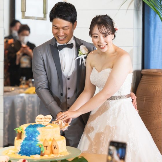 また、私たちは食べることが好きなので、料理や、ケーキにもこだわりました。特にウェディングケーキのデザインは海をイメージして、会場のリゾート感を損なわないようにこだわりました。