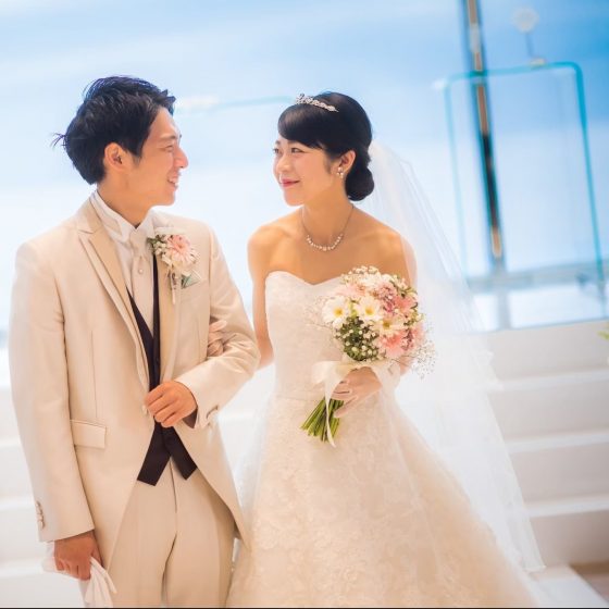 大きな窓に空と海が見える白を基調とした挙式会場がとてもきれいで、魅力を感じました。