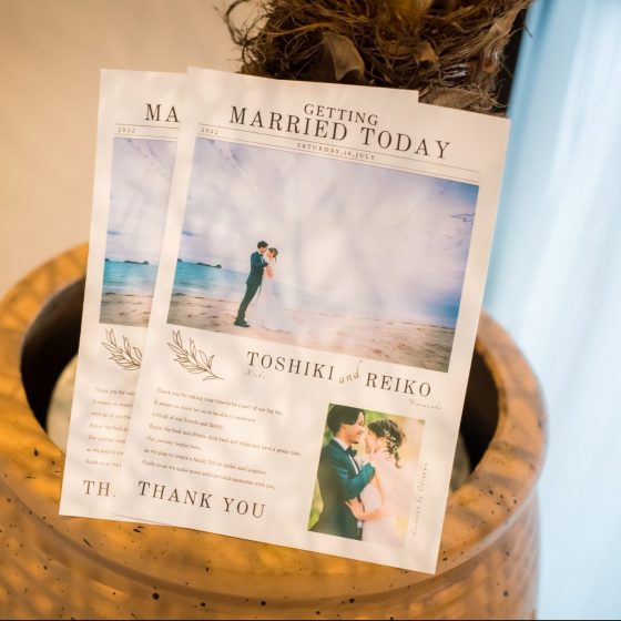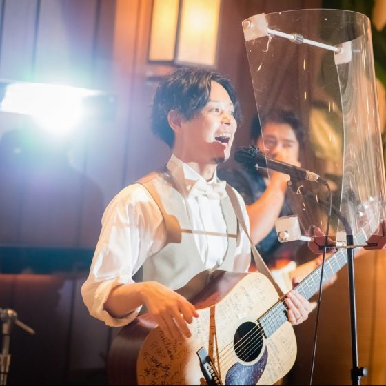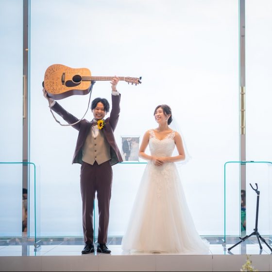 また、同世代のゲストが多く、同窓会をテーマにしていたため、ゲストも参加して楽しめるようにブライズメイドやブーケブートニアセレモニー、持ち込みのギターへの署名などオリジナルの演出も取り入れました。