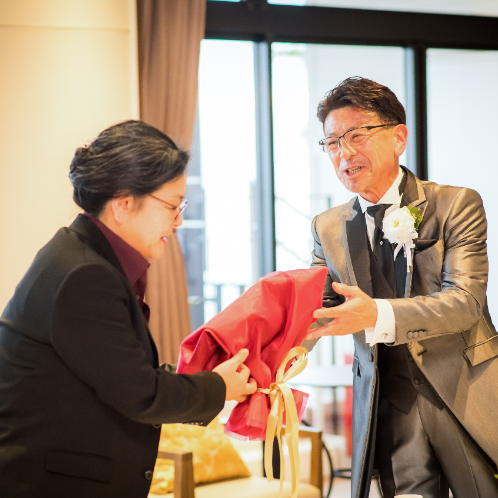 当日はとにかく、サーフの皆さんの細やかな気遣いに感動しっぱなしでした。準備のときから、緊張している私達の気持ちを楽しい会話でほぐしてくれたり、両親へのサポートもよくして下さいました。雨がやんで、外で撮影出来るようにスタッフの皆さんがテラスを一生懸命掃除してくれている姿が忘れられません。何より、家族が楽しい時間を過ごせて、いい結婚式だったね、と言ってくれた事が嬉しく、サーフで挙式できて本当に良かったと思います。父親はまた両家の集まりをレストランでやりたいと言ってます。