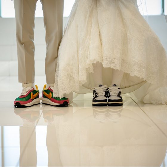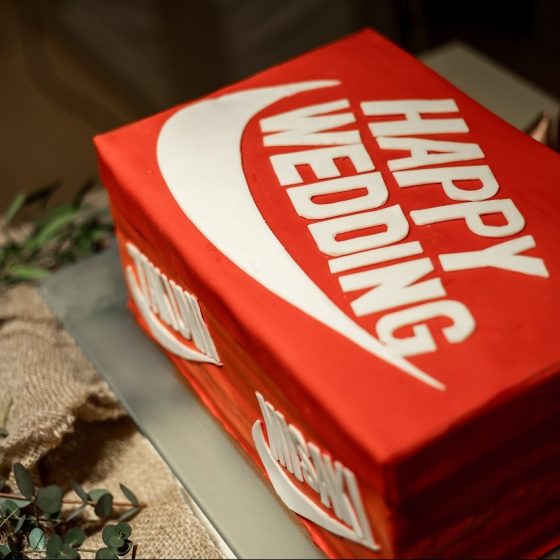 スニーカーをドレスコードにしたことです。また自分たちもタキシードとドレスにあわせてお気に入りのスニーカーで当日を迎えました。そのほかにも、ケーキを靴箱のデザインにしたり、ケーキバイトを靴ベラでするなど、スニーカー一色の式を作りました。