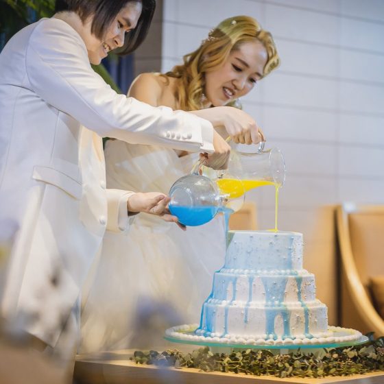 お酒のドリンクバーの設置や、ドレスや髪型を他と被らないスタイルにしたり、カラードレスのブーケは手作りをしたりと、自分達の好きを詰め込みました。ブーケや装花のカラー・お花の種類なども全て一から決めさせてもらえました!