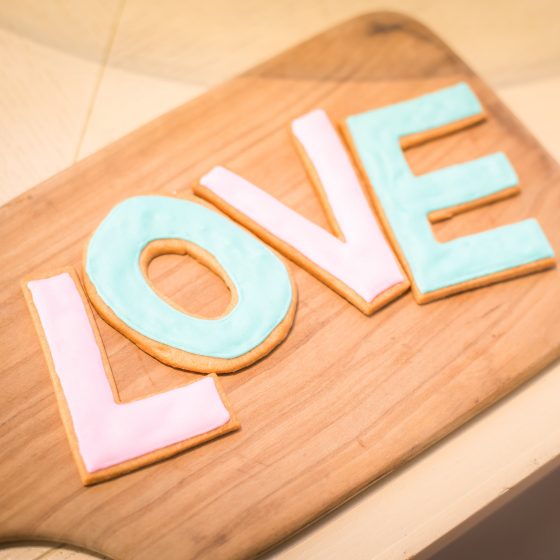ウエディングケーキに「LOVE」のクッキーをピンクの水色に作って貰い、