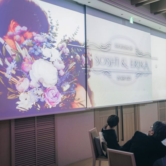 披露宴は3面スクリーンのオープニングでの入場から始まり、