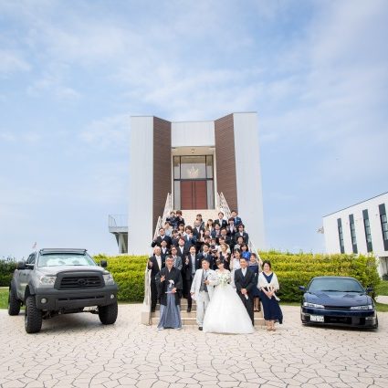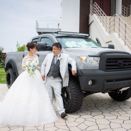 新郎の愛車の大きい車を置いて写真撮影する場所があって、