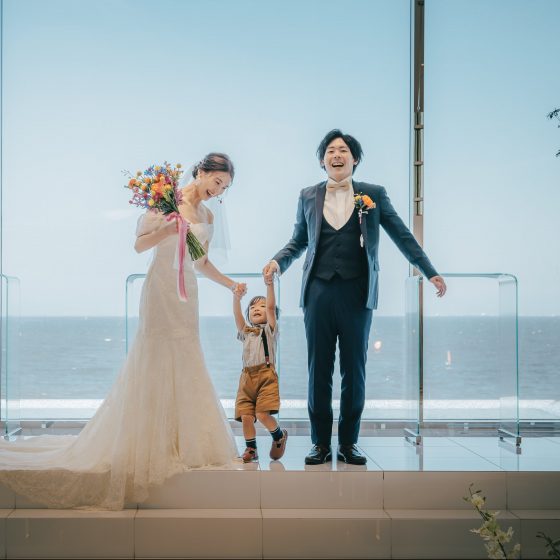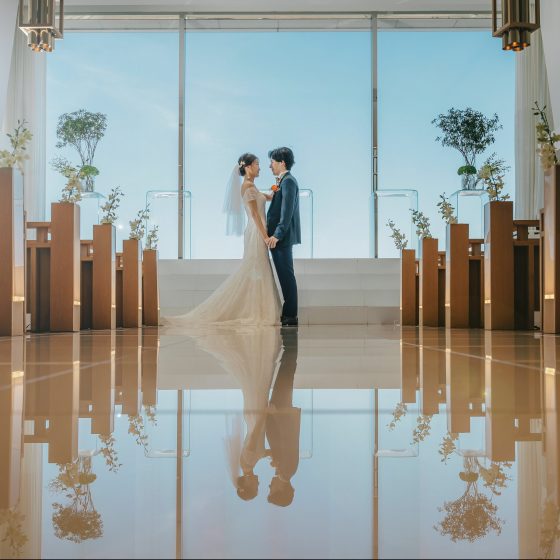 ガラス張りの挙式会場は海が映えるようになのかシンプルな造りをしている部分にも惹かれました。