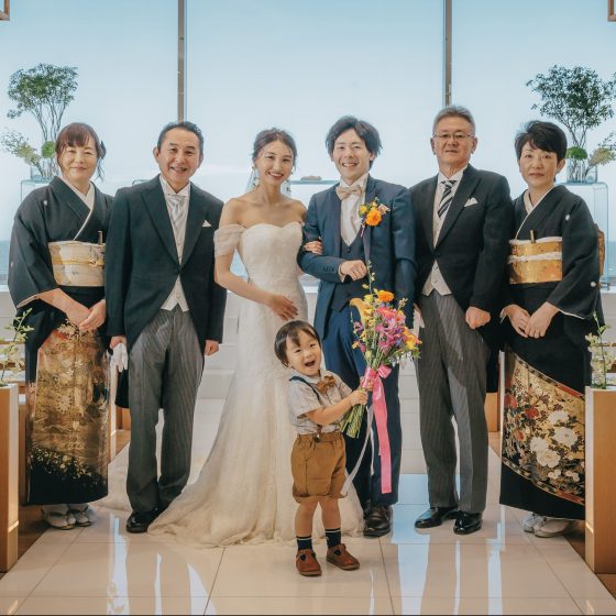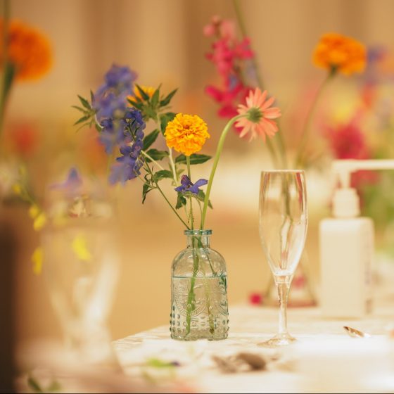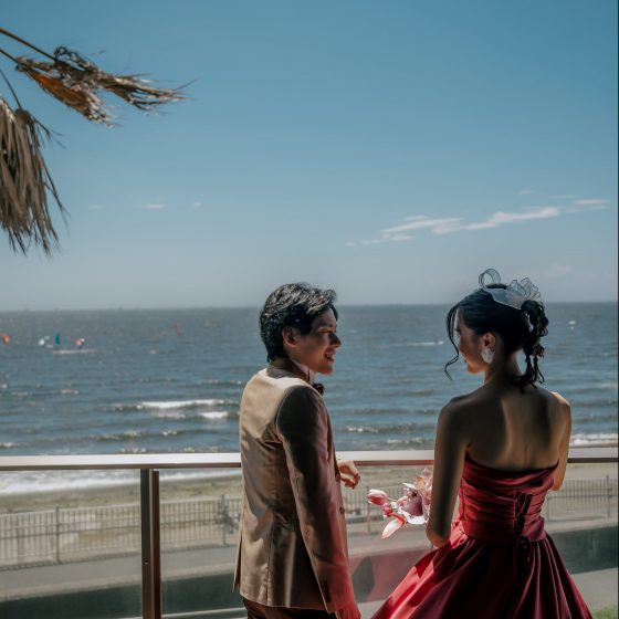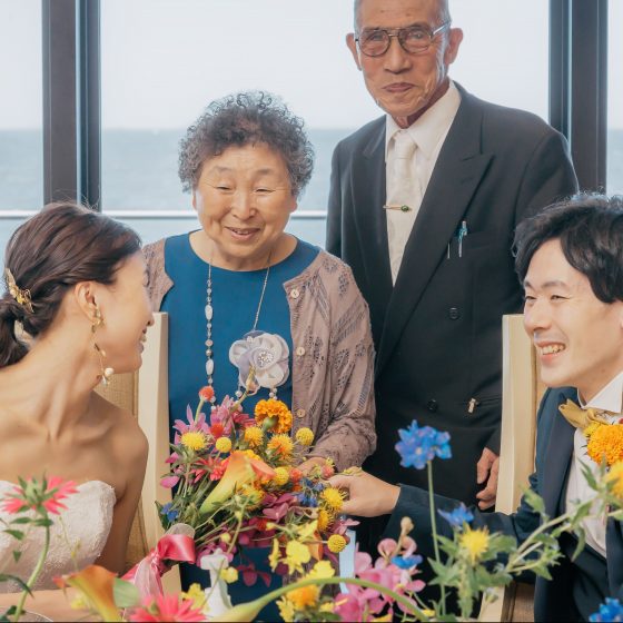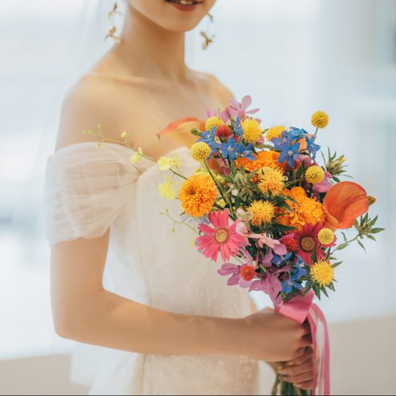 また、披露宴会場のLINOから見える海の景色も気に入りました。LINOは青を基調としていてカラフル装花の一部として馴染みそうだと思い選びました。