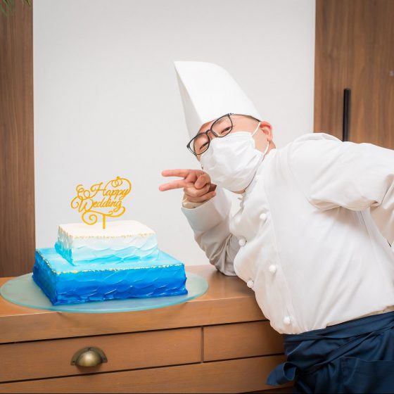 ケーキも海(青系)にこだわりました。妻の誕生日だったのでシェフの格好をした私がプロデューサーさんと一緒に妻の元に運びケーキバイトをするというサプライズを数ヶ月前から計画して実行しました。