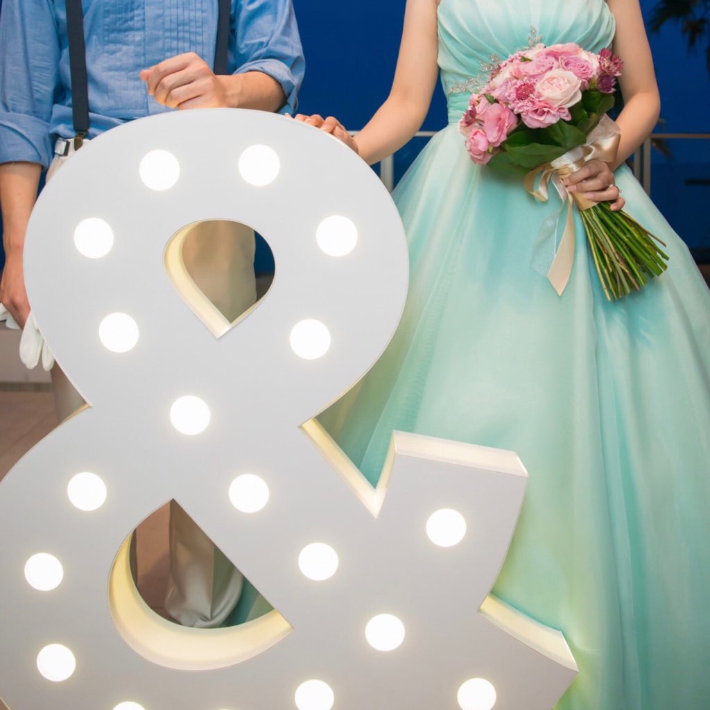 装花へはジュエリーライトを入れてもらったり、お色直し後の入場では大きな光り輝く"&"オブジェを使って入場!