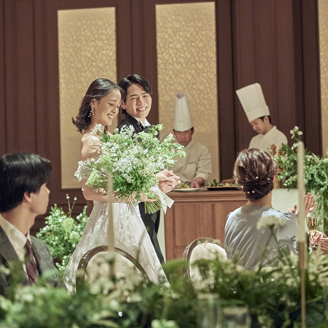 重厚なブラウンを基調にしたバンケットは、日本建築の伝統を生かした格子天井や、鎌倉の大銀杏からインスピレーションを受けた和紙の照明など、随所に和のモチーフをあしらった上質感漂うインテリア。おふたりの門出にふさわしい、気品と華やぎに満ちたパーティーを演出いたします。