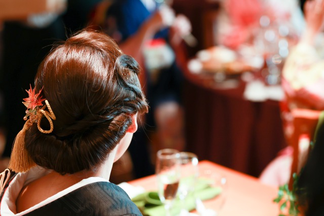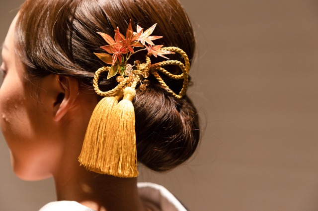 髪飾りには秋らしさを感じるもみじを取り入れ