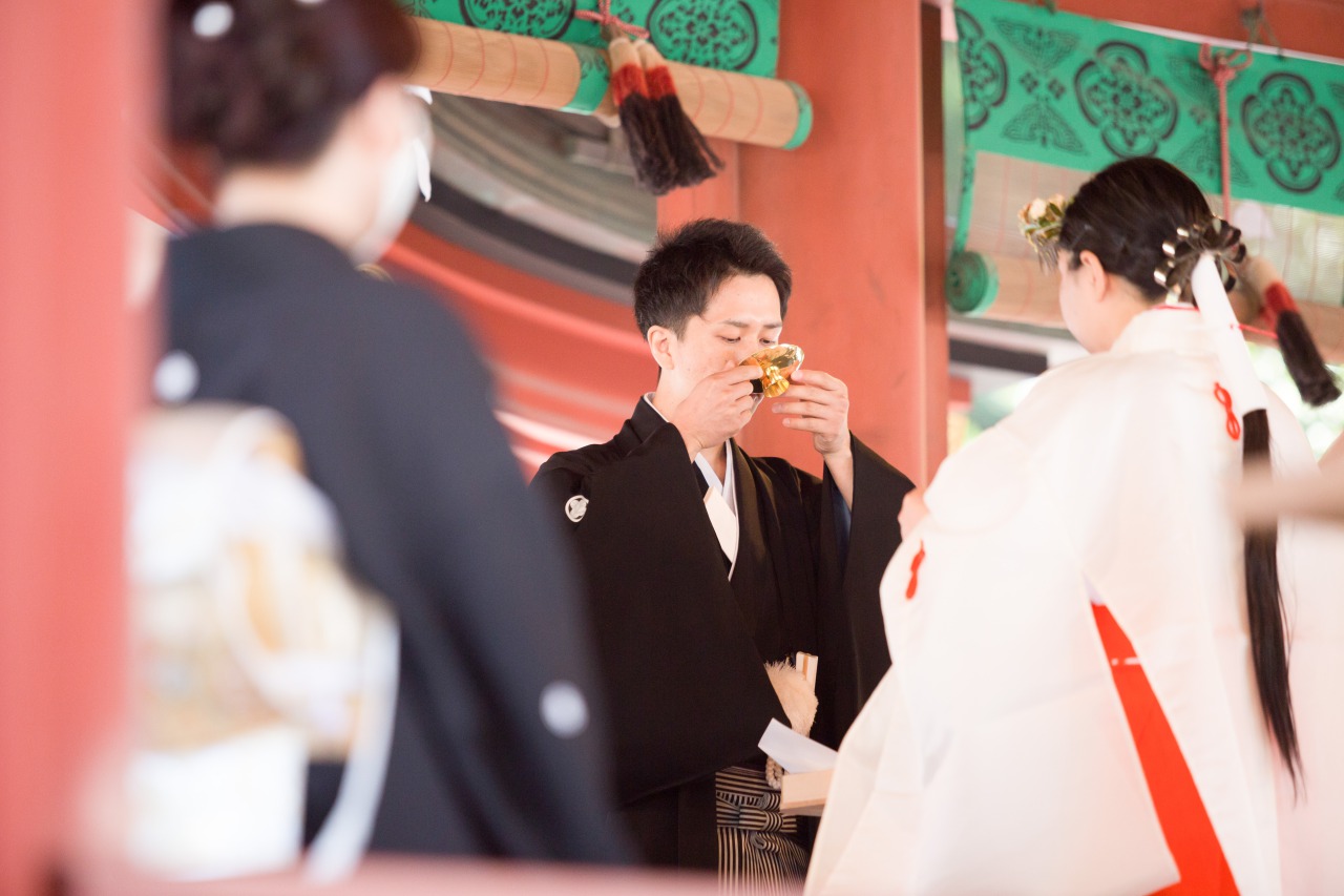 「三つの杯を使って、三回で注ぎ、三回で飲み、新郎新婦合わせて合計九回神酒を飲む」