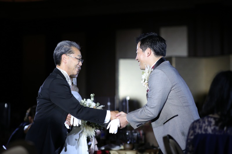ご新郎様とお父様とで、固い握手を交わしていただきます