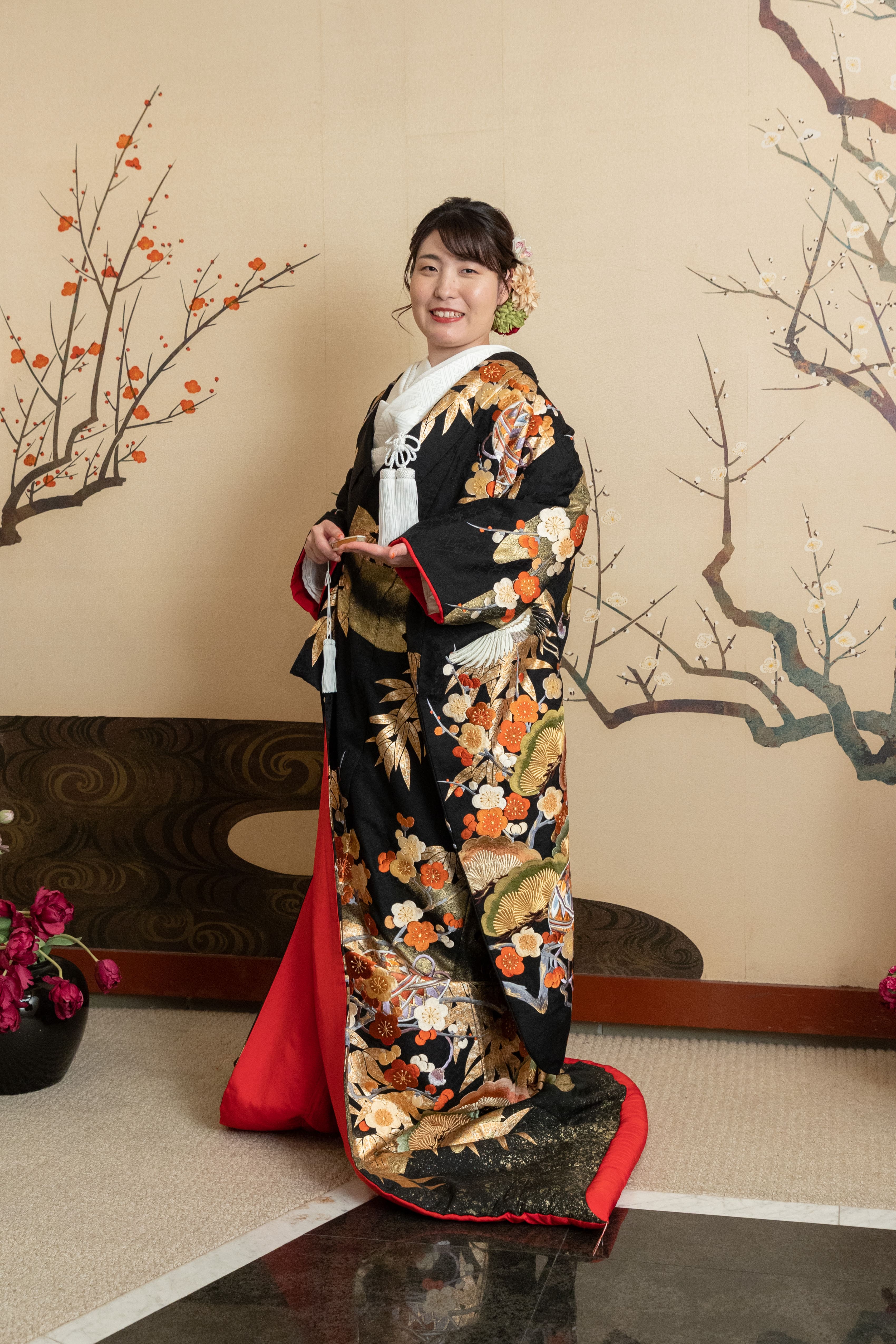 色打掛は黒に梅や松が施された素敵なデザイン