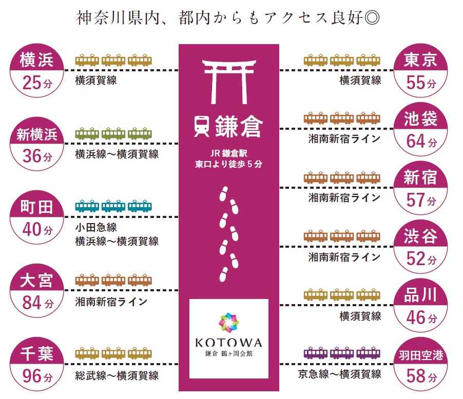 さらに、鎌倉駅は横須賀線、湘南新宿ライン、有名な江ノ島電鉄と主要電線が3つも通るからこそ、多方面からのアクセスも乗り換えが少なくお越しいただくことが出来ます。