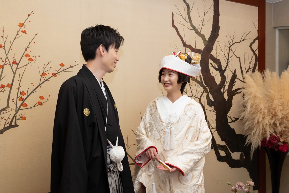 神前式は、日本古来の伝統的な結婚式スタイルです。神社で神様を前に、新郎様新婦様が神前で結び目を交わします。