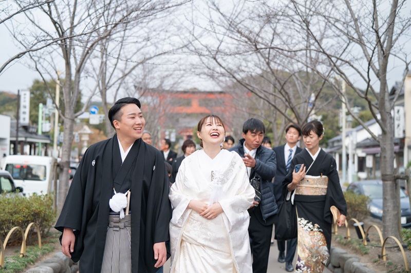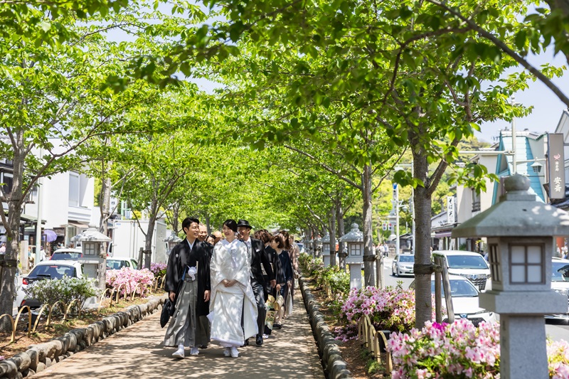 鶴岡八幡宮での挙式後には、おふたりとご家族の皆様で鶴岡八幡宮の象徴的な石畳の道「段葛」をゆっくりと歩いてKOTOWA 鎌倉 鶴ヶ岡会館までお戻りになれます。