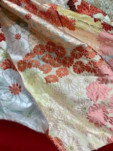日本の国花とされる多種多様な菊が優しく温かみのある色合いで全体に広がった一着