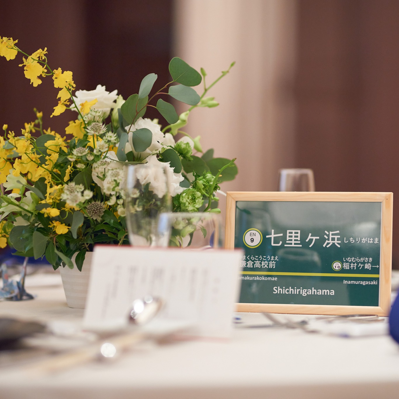 各テーブルは江ノ電の駅名にし、卓札は江ノ電の駅名標を、エスコートカードは交通系ICカードに似せたものを作りました。
