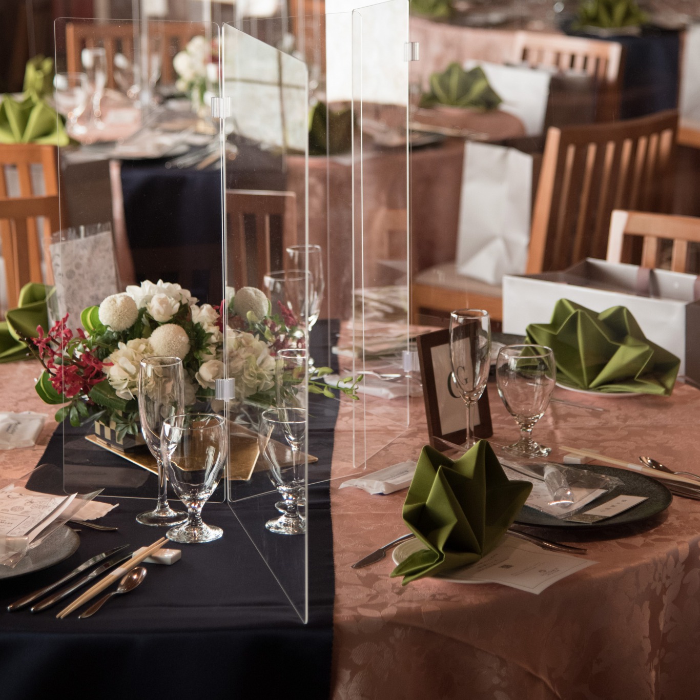 その為、私たちも感染対策を徹底し一人ひとりに消毒用のアルコールスプレーとマスクケースをご用意し各テーブルに飛沫防止のアクリルパネルを設置しました。