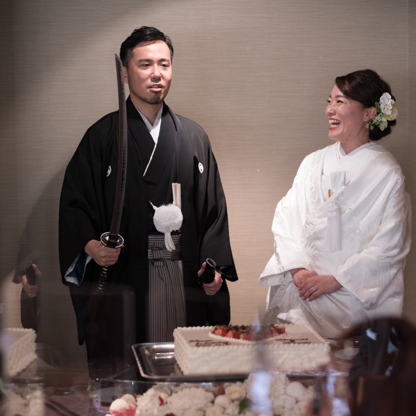 1つ目の演出で取り入れたのはケーキ入刀の際に日本刀(模造刀)を使ってケーキ入刀をしました。
