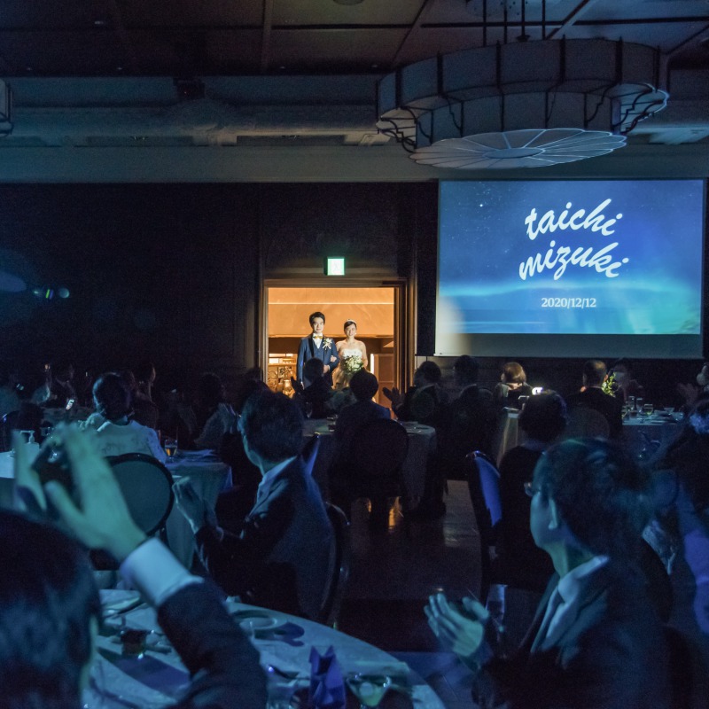 音楽については早い段階で曲リストを作り、演出担当の方と綿密に相談を続けました。また、映像演出については一部オリジナルでの制作をお願いし、イメージをお伝えしながらゼロから作り上げていきました。特にオープニングについては、毎回の打合せや前撮りの様子を撮影頂いて動画素材を集め、それらを大好きなバンドのライブ演出さながらに編集いただきました。初めて出来上がりを見せていただいた際は、あまりの完成度の高さに、自分達が写っている映像なのに思わず泣きそうになってしまいました(笑)