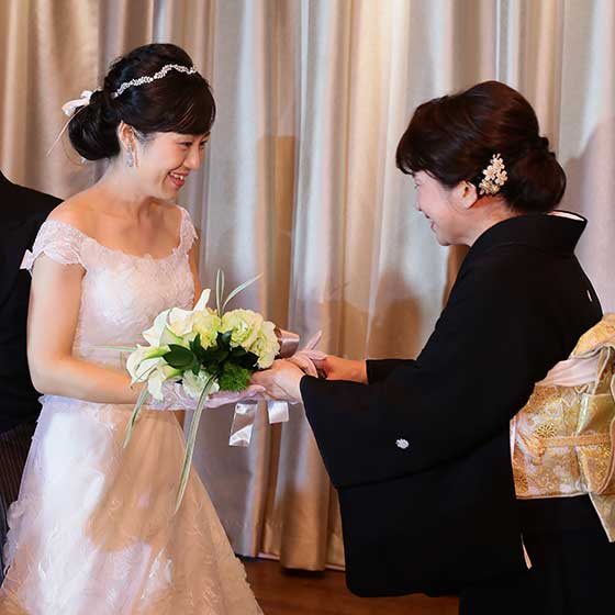 感謝を伝える場面では、お色直しの場面で洋装に着替え引渡しの儀(バージンロード)の演出をしました。