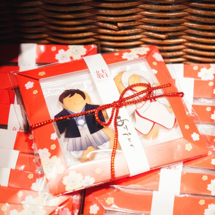 まだまだ油断できない状況の中、参加してくれたゲストの方々に少しでも安心して過ごしていただけるように、エチケットギフトを作りました。マスクやアルコールジェルなど、会場の雰囲気を想像してデザインしました。