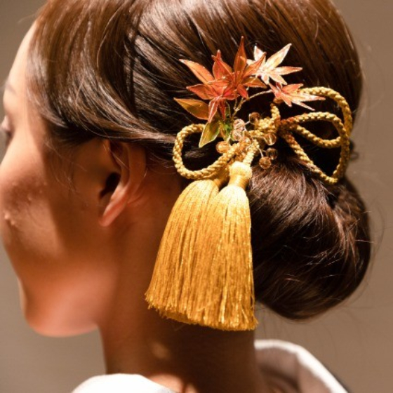 ウェディングケーキは紅葉のチョコレートでデコレーション。ケーキカットする際の和装ヘアに、紅葉のかんざしを挿して統一感。