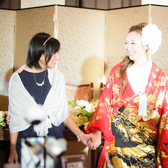 華やかにしたかったので、飾り付けのお花はこだわりました。衣装も、昔ながらの衣装に今どき感を出すため洋風ヘアアレンジにしてもらいました。