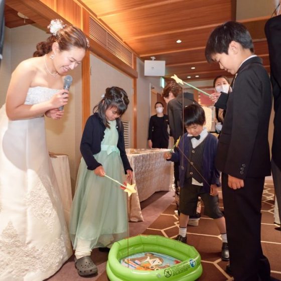 家族のみ少人数の披露宴で、なかなか集まれない親戚が集まってくれたのでみんなが参加できる披露宴にしたいと考えていました。そこで、お孫ちゃんたちの力を借りて景品付きのを魚釣りゲームをしてみました。子どもに親戚の名前を書いた魚を釣ってもらい、当たった人から一言をもらいました。主人が食品メーカーに勤めていたので会社の商品や二人の好きなものを景品で用意し、お土産にしたりもしました。子どもたちも喜んでくれて、一人ずつにメッセージをいただくことができてとてもいい思い出です。これは友達や会社の方などを呼んだ大きな披露宴ではできなかったと思いやってよかったです。小さなビニールプールを前日の準備で主人が会場で膨らませていたのも面白かったです!