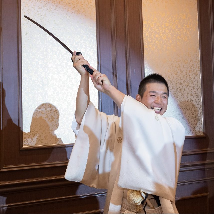 自分の好きなキャラクターが乗ったケーキを作っていただきました。クオリティが高くて嬉しかった思い出です。また、旦那が普段から木刀の素振りや居合刀の抜刀の稽古をしていたため、日本刀を使って入刀できたのも楽しかったです。