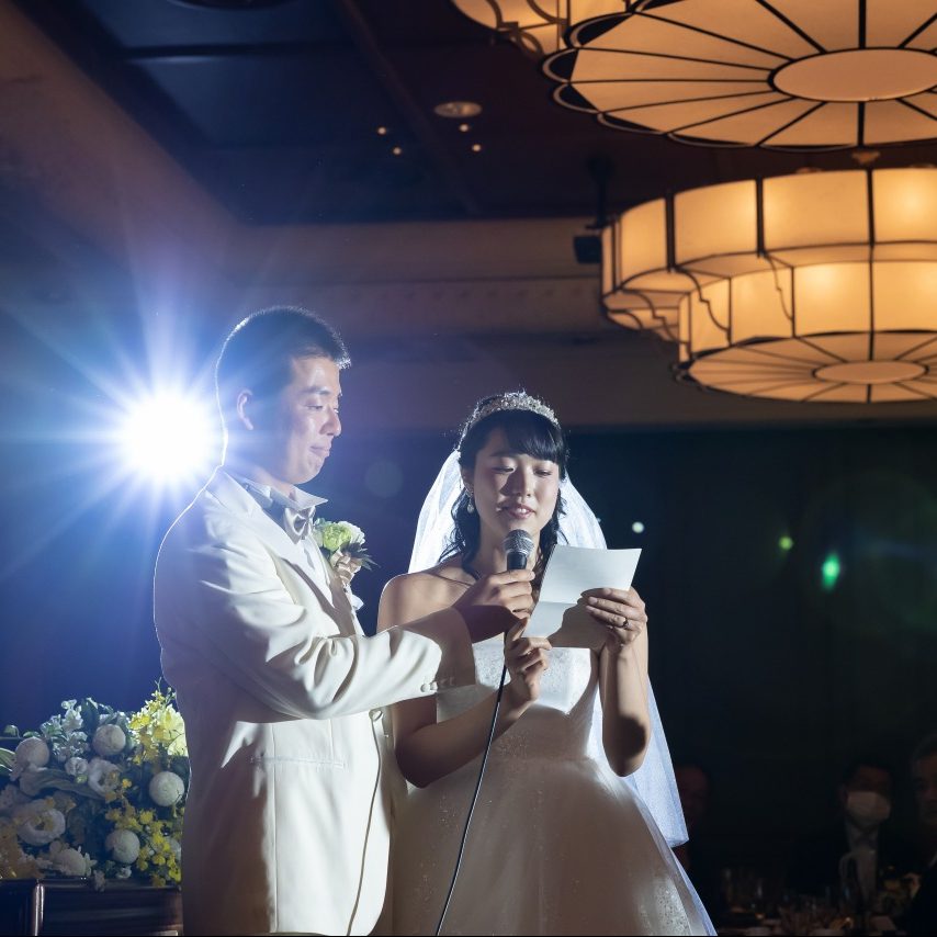 今回はクレールストーリアを使ってゲストの皆様に感謝のメッセージを伝えました。披露宴中はスケジュールが盛り沢山でゲストとゆっくりお話できなかったので、この演出が出来て本当に良かったと思ってます。また、キャンドルの火を繋ぐ様子やキャンドルの灯りはロマンチックで良い雰囲気でした。
