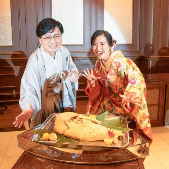 また、ウェディングケーキは見慣れている方も多いため、代案として演出に使った鯛の塩釜焼も、とても凝ったもので打ち壊すのがもったいない位でした。