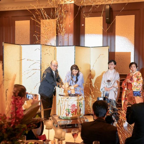 また、最もゲストの写真撮影が多く大好評だった鯛の塩釜焼、鏡開きと思わせてアッと驚く演出のドンパ、暗転から突然灯されるキャンドル演出など、他では見ない演出も多数取り入れ、演出を考えた自分たちも当日がどうなるか楽しみなくらいでした。