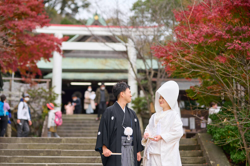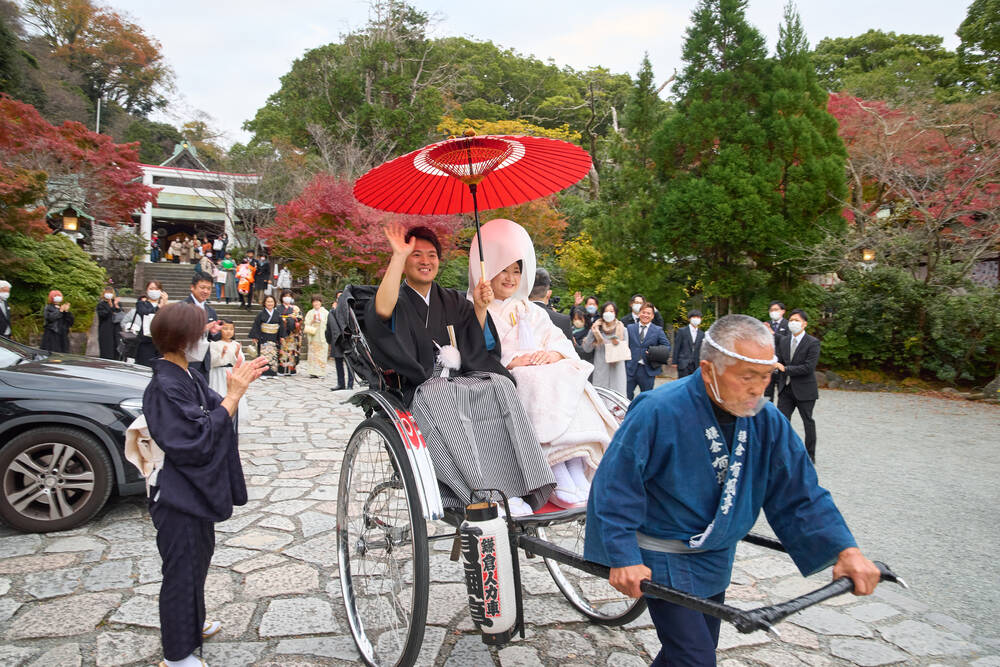 式は神社での神前式が良かったので、叶えられて良かったです。鶴岡八幡宮と迷いましたが、鎌倉宮で挙げました。少し会館からは遠かったですが、人も少なく静かで洗練された空間の中での式でとても良かったです。紅葉の時期に天候にも恵まれ、厳かな雰囲気の中、素敵な式を挙げる事ができました。会館までの帰路は人力車にも乗ることができて、道行く人から祝福されて貴重な体験もできました。