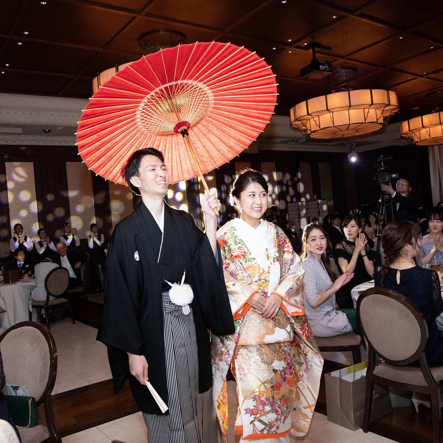 来てくださった方一人一人とお話ししたいと思っていたので、テーブルフォトラウンドの時間を長めに取っていただきました。また、挙式(参進の儀)では母に手をとってもらって歩いたので、披露宴ではドレスにお色直しをした後に父と入場し、新郎への引き渡しの儀を行いました。