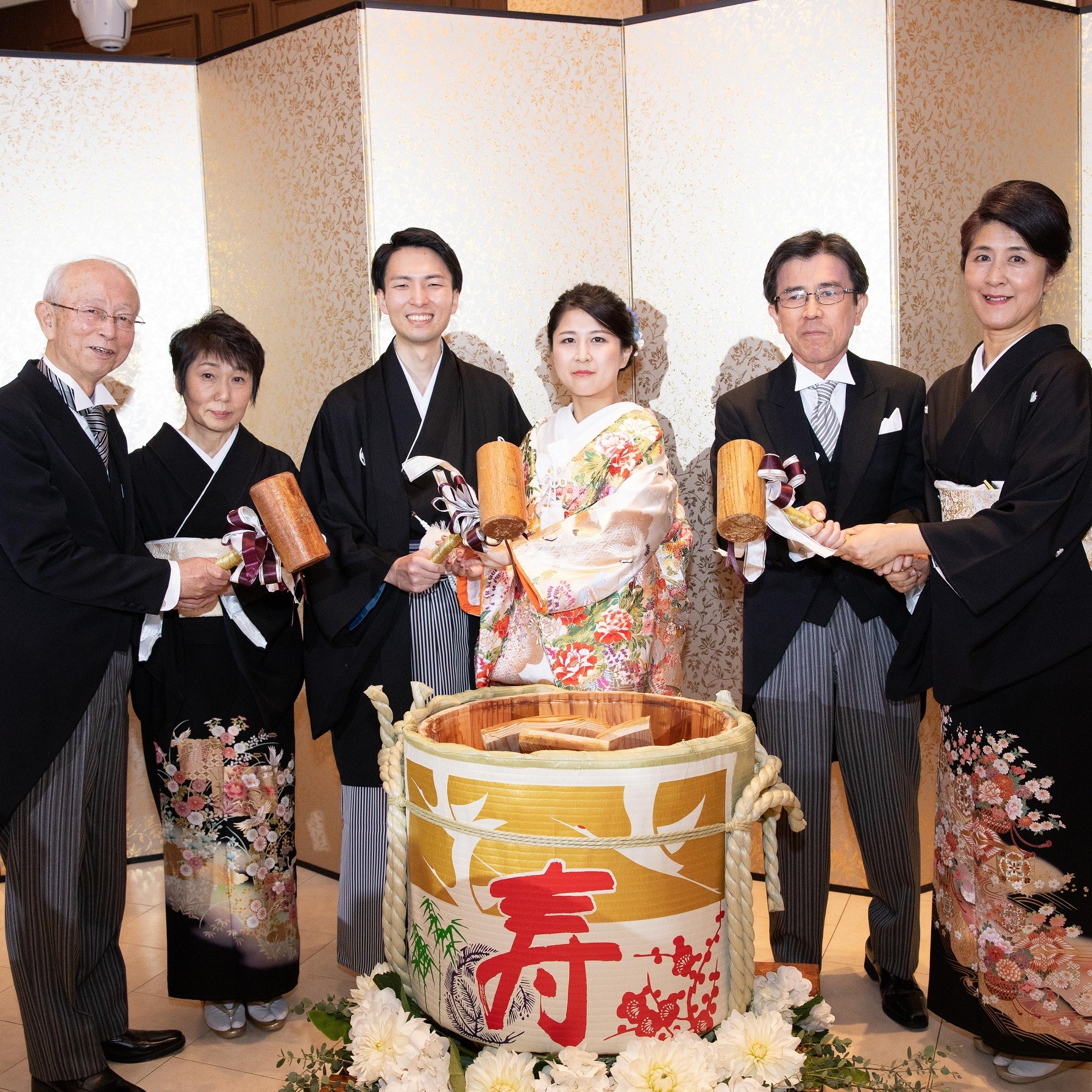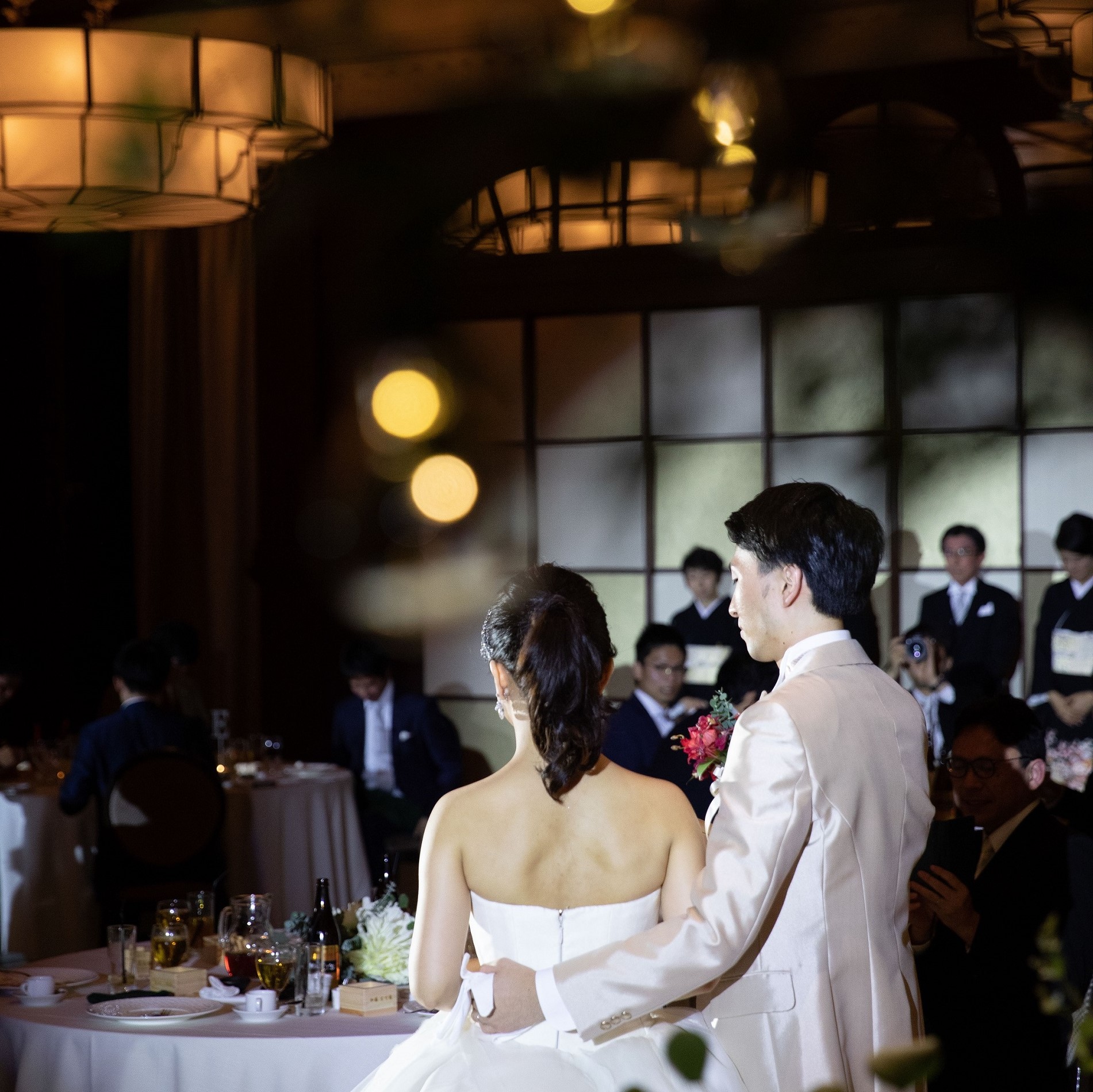 私たちが座る高砂にはウッドチェアを使用しました。テーブルがないことで、来てくださった方々との距離がぐっと近くなりました。また、写真撮影の際もお気に入りの着物やドレス・タキシードが全身しっかりと写真に収まって嬉しかったです。
