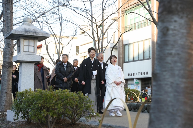 神前式は親族のみで行うため通常見ることが難しいが鶴岡八幡宮舞殿では周りから見学できる点も素敵だと感じた。