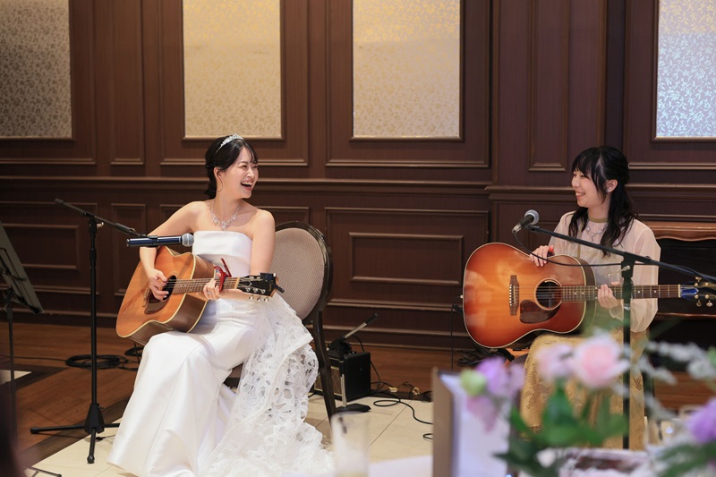 そして、新婦は大学時代のアコギサークルの友人と一緒にウェディングドレスで新婦が弾き語りもしました!