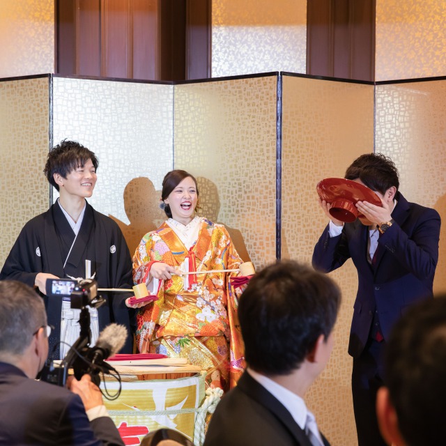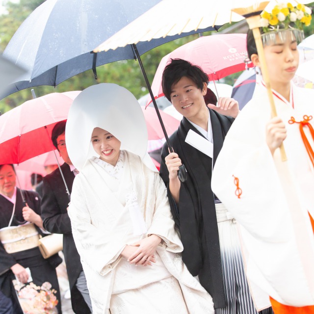 当日はまさかの雨天で不安な気持ちでいっぱいでしたが、スタッフさんの細やかな配慮のおかげで無事に挙式を執り行なうことができました。また、挙式中は舞殿前に集まってくれたたくさんのゲストの顔を見て安心し、思わず涙したのをよく覚えています。たくさんの方に見守って頂き、改めて多くの人に支えられているのだと実感した瞬間でもありました。