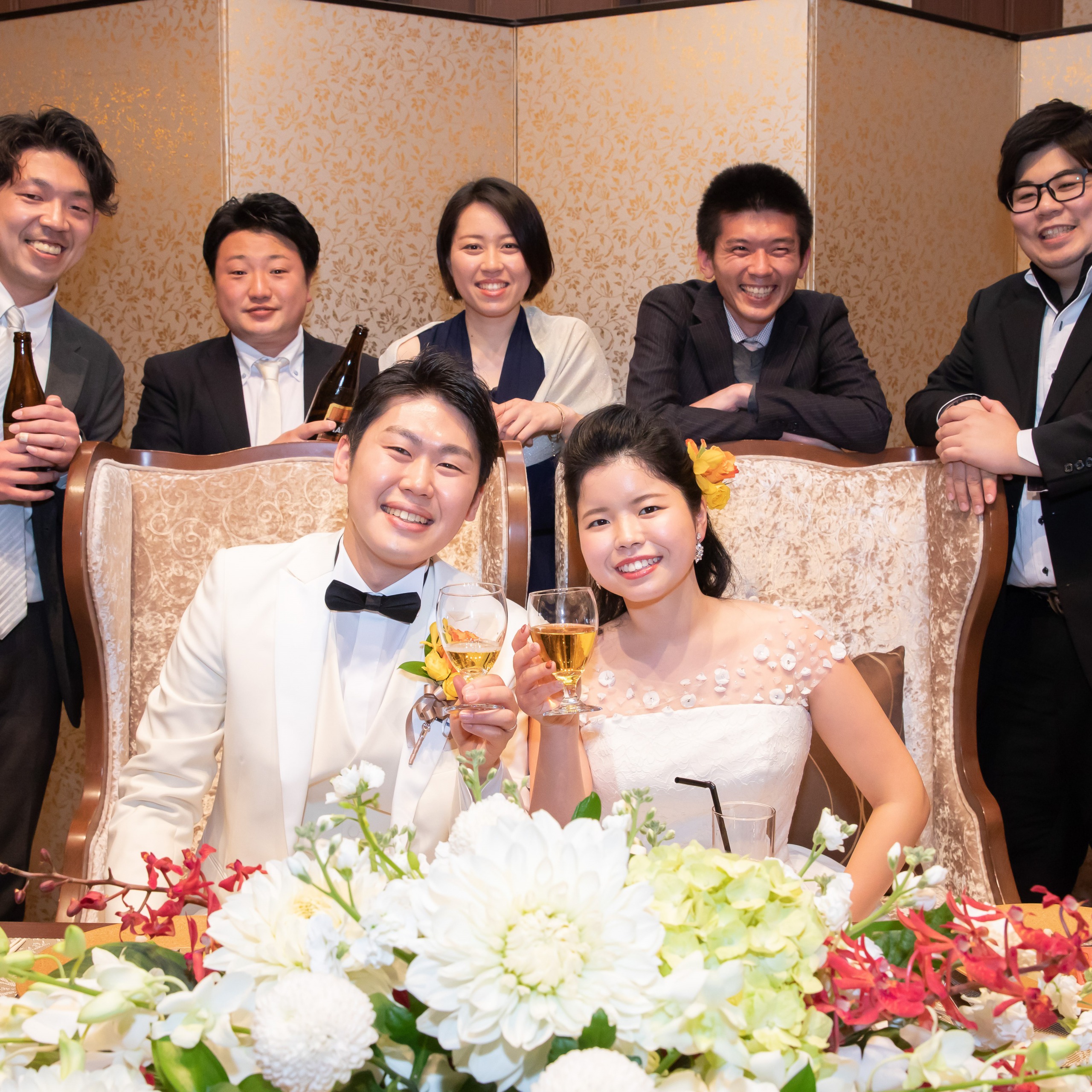 打ち合わせ時の思いもあり、披露宴の節々に列席者への感謝を伝える場所を作りました。列席者の各テーブルに周りながら記念撮影を撮りました。