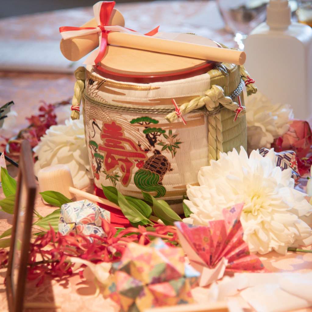 乾杯の鏡開きは私達と両親のみで行うため、ゲストにも樽を割ってもらう演出を用意しました。各ゲストテーブルに小さい樽を置き、その中にプチギフトを入れました。この演出は面白いと好評で喜んでもらえて私達も嬉しかったです。