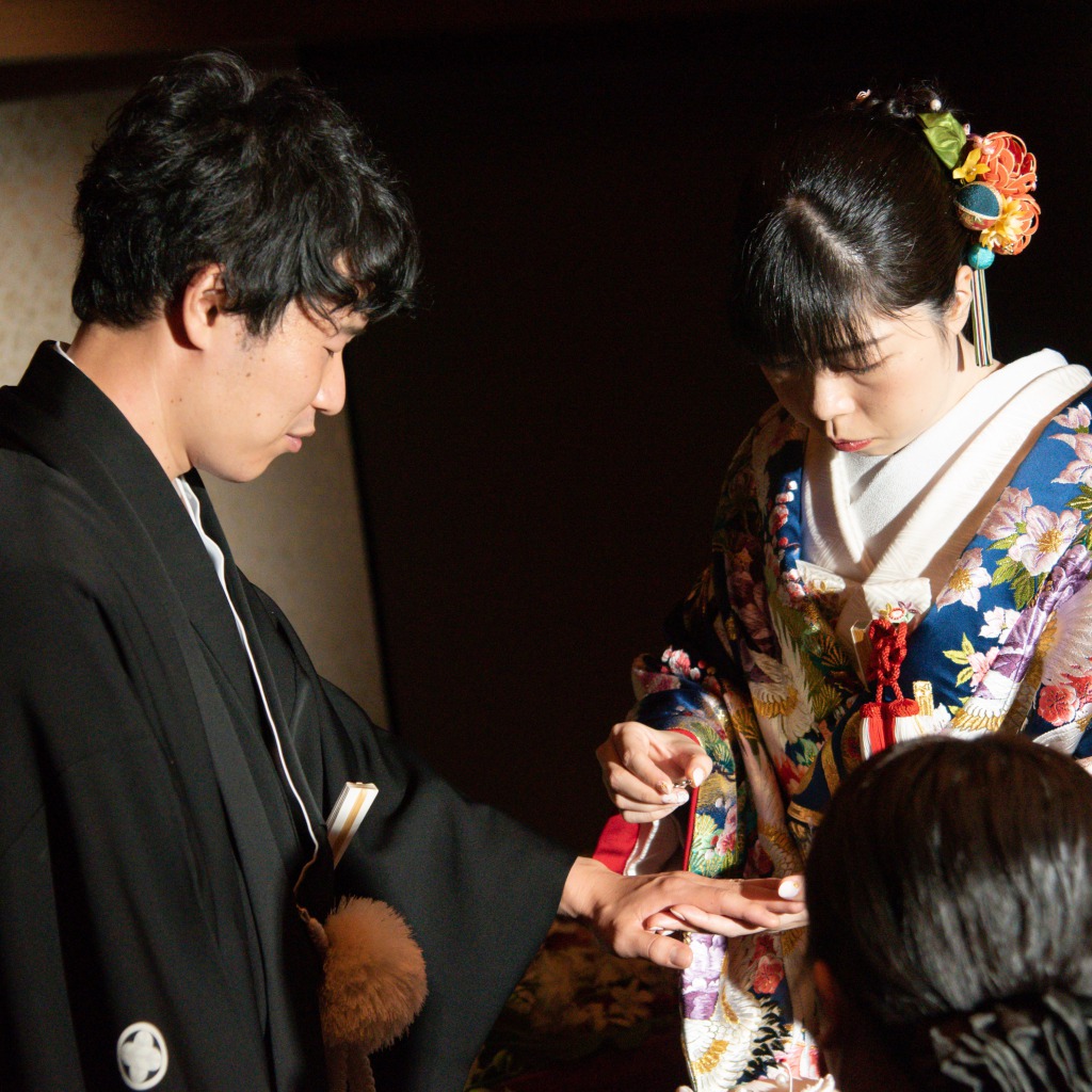 指輪交換は挙式では行わずに披露宴で行う予定でした。プランナーの方から挙式が神前式なので教会式の要素を取り入れたらどうかと提案を受けました。バージンロードを歩くことにも憧れがあったので、とても素敵だと思い取り入れました。
